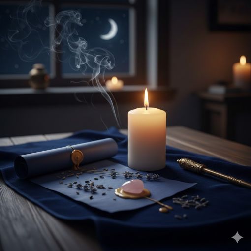 Mekan Hazırlığı: Loş bir oda seç. Lacivert bir örtü üzerine beyaz mumunu yak. Odanın enerjisini bir tütsü ile temizle.
